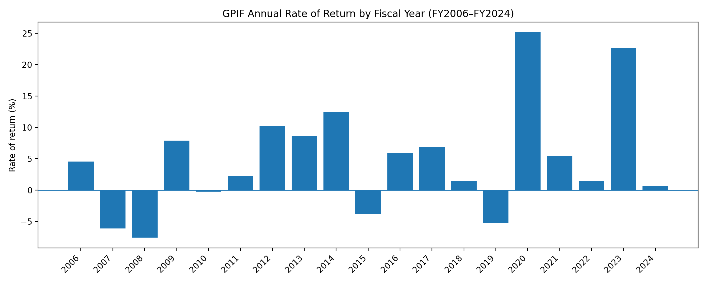 日本の公的ファンド(実質的に代表例となる GPIF)について、過去約20年(FY2006–FY2024)の年度別運用成績(収益率)グラフ