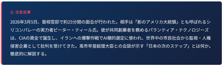 ② 訪米直前:高市総理はこの会談の約2週間後(3月19日予定)にワシントンでトランプ大統領と首脳会談を行う予定だった。トランプ政権に強い影響力を持つティール氏との面会は、その準備工作の意味も持つとみられている。